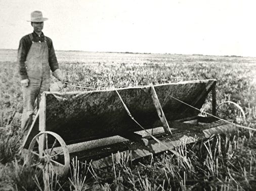 Relevance can be a close cousin to necessity for innovation. As the grasshoppers chewed through Kansas, enterprising farmers devised clever tools to snag them from the fields, including this deceptively simple looking device that scooped up grasshoppers and deposited them in…….why, in a hopper, of course. Dozens were sold.