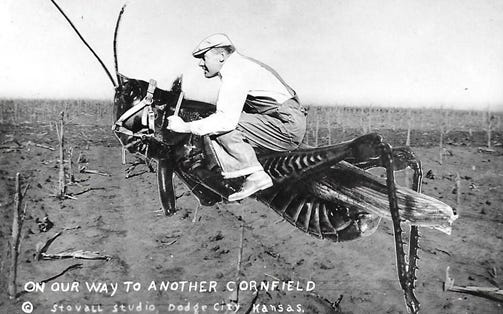 Long before fake news and visual deep fakes, plains hustlers capitalized on the Grasshopper Plague by creating comedic enlargements of the ungainly insects. It was Kansas’ time to shine, and no exaggeration was off limits in the state’s quest for national attention. Even after the locusts were eradicated into extinction, photos of stupendous ears of corn and mutant tomatoes the size of automobiles were a feature of desperation on the flatlands.